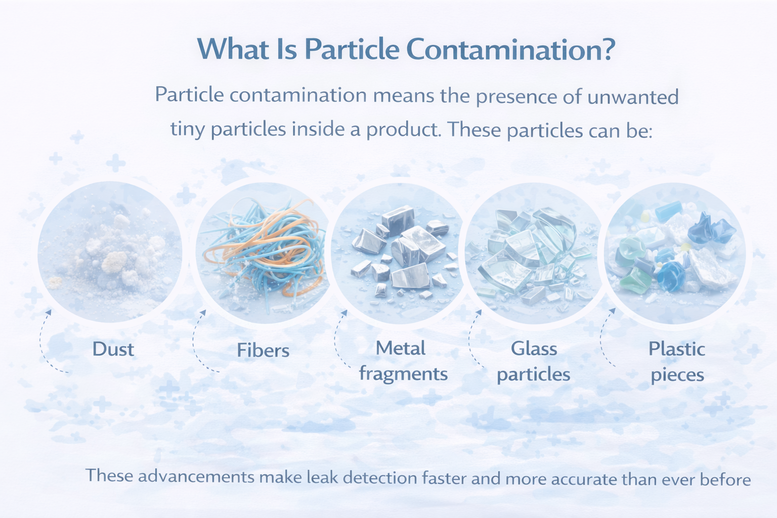 Particle contamination means the presence of unwanted tiny particles inside a product. These particles can be: